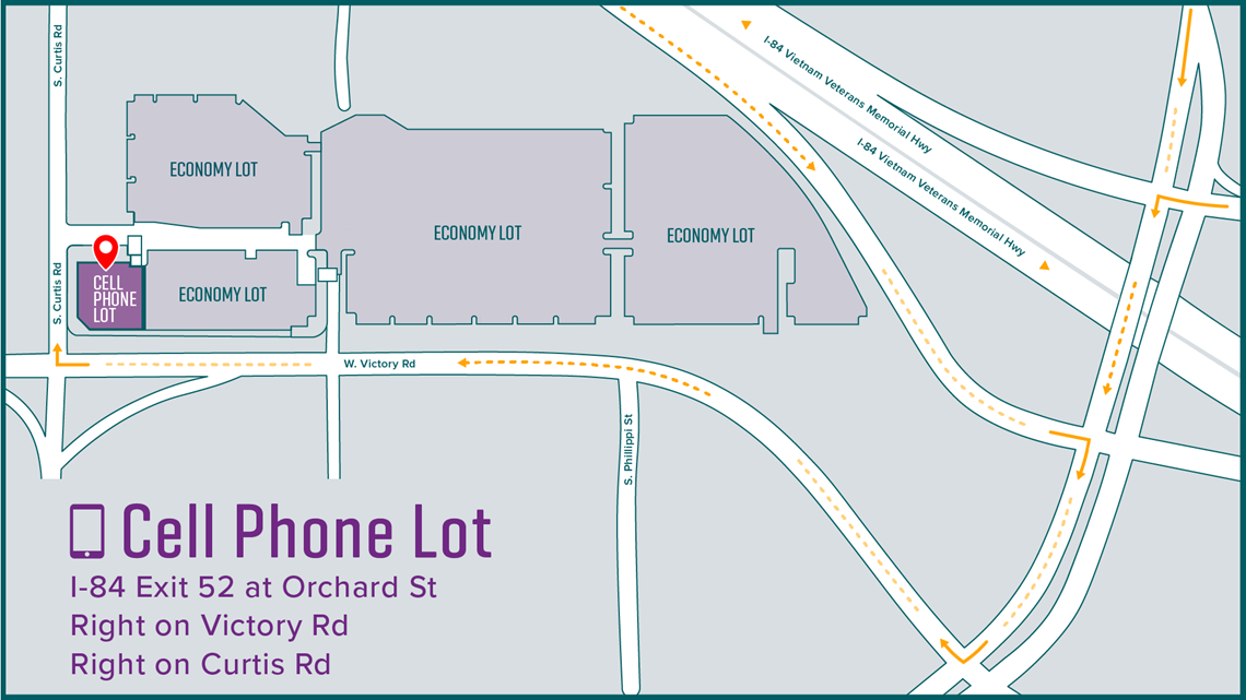 The previous cell phone waiting area is now closed and not available for use. Please follow signs to the new cell phone lot or use a smartphone mapping app to navigate to 2950 S. Curtis Road.