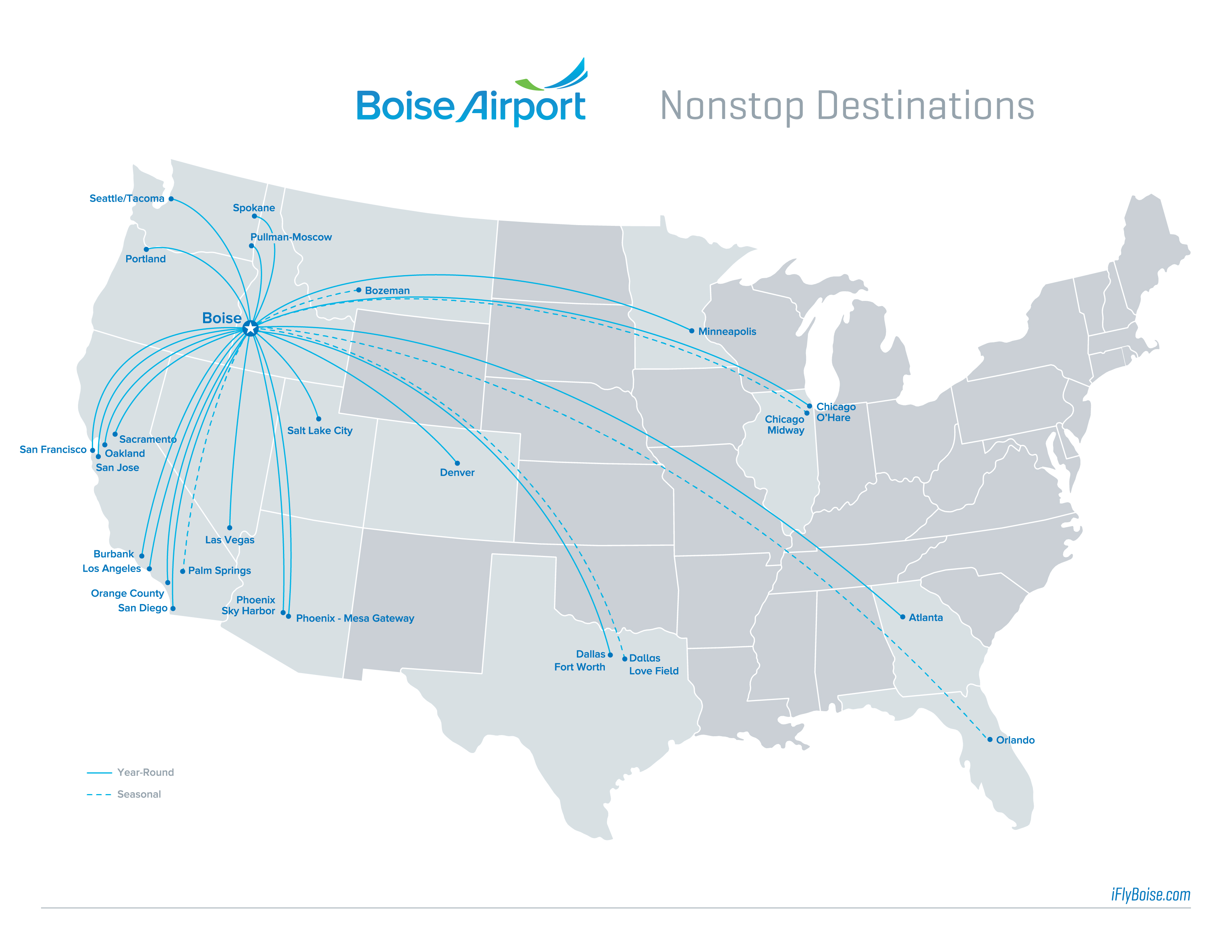Boise Airport is served by eight airlines that offer nonstop flights to 26 destinations with easy one-stop connections to over 350 cities worldwide.